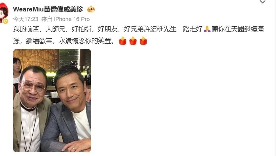 高海宁也在社交平台发布与许绍雄的合影,写道:“老爸,一路走好。”言语简短却饱含深情。