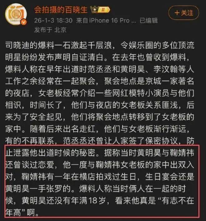娱乐记者百晓生透露,早在去年,他就收到关于范丞丞、李汶翰、黄明昊等男星的爆料。据说,这几位男星刚出道时,常在北京一家夜店聚会,夜店女老板还常将网红模特和小演员介绍给他们认识。